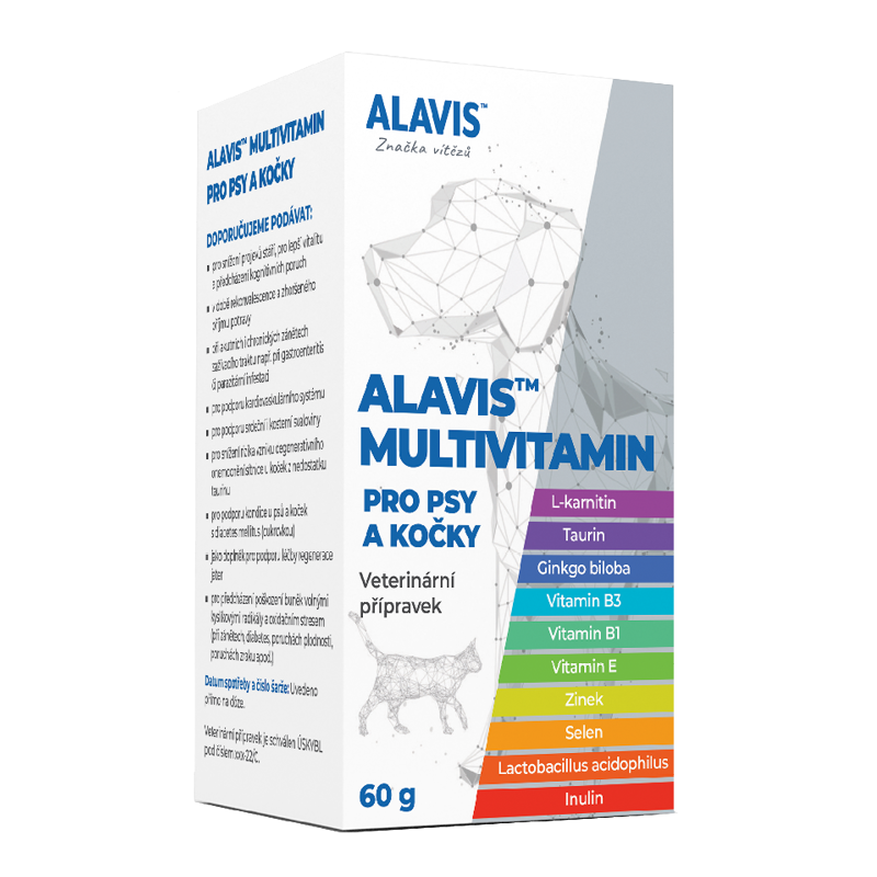 ALAVIS™ Multivitamin pro psy a kočky napomáhá ke zmírnění projevů stáří, pro lepší vitalitu a předcházení kognitivních poruch. Vhodný je také jako doplněk pro podporu léčby regenerace jater nebo pro předcházení poškození buněk volnými kyslíkovými radikály a oxidačním stresem (při zánětech, diabetes, poruchách plodnosti, poruchách zraku apod.).